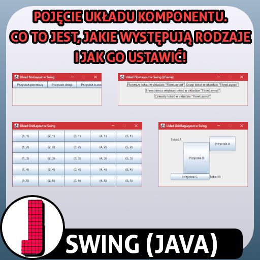Materiał uzupełniający na temat biblioteki "Swing" języka Java 📜! Znajdziesz w nim informacje na temat tego, czym jest układ w "Swing", jak go ustawić dla ramki i panelu ("JFrame" i "JPanel") oraz jakie występują rodzaje i czym się charakteryzują 💡. Jak interesuje Cię zgłębianie biblioteki "Swing", to prosimy do środka 🔍!